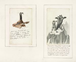 Recueil inédit de 11 dessins originaux au crayon ou à la gouache, signés par Adrien de Mun, montés et légendés, racontant le voyage de chasse de l’auteur dans les Pyrénées.