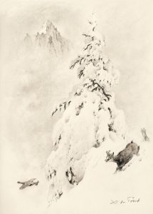 Unique édition d’un des plus beaux livres de chasse en montagne et une des illustrations les plus réussies de Xavier de Poret.