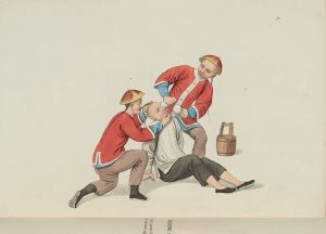 orné, encadrements or et à froid sur les plats, tranches dorées (reliure anglaise de l'époque). Deuxième édition. Luxueux ouvrage imprimé sur vélin Whatman. Le texte bilingue, attribué au commandant Mason, décrit par le menu ce que les scènes de supplices rendent encore plus sensibles : Un criminel recevant la bastonnade, Manière de tordre les oreilles, Punition de la secousse ou braudilloire, La question, Manière de brüler lesyeux avec la chaux, la punition du collier de bois, Supplice de couper le jarret, Manière de couper la tête. 22 PLANCHES GRAVEES SUR CUIVRE AU POINTILLE ET IMPRIMEES EN COULEURS PAR DADLEY. Exemplaire en maroquin decore de l'époque. Déchirure sur la dernière planche sans manque. (Abbey, Travel in Aquatint II, n° 352.- Colas, Bibliographie du costume I, n° 2011.- Lust, Western Books on China Published up to 1850 : "The view expressed in the preface was that legal torture was an instrument of tyranny, an attitude perhaps indicative of pressures in Britain for legal reform.”)