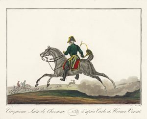 Premier tirage de cette suite d’un titre illustré et de 55 (sur 60) gravures de chevaux d’après les dessins de Carle et Horace Vernet, parmi lesquelles 21 sont consacrées à la chasse.