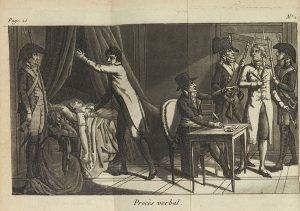 commis par ce scélérat envers la jeune Rosalie, sa fille ainée ; suivie d'un dialogue entre Trumeau et Desrues aux Enfers. Avec gravures. Paris, Bonneville, 1803. In-12, veau marbré, dos à nerfs orné, tranches rouges (reliure postérieure). RARISSIME EDITION ORIGINALE, ILLUSTREE. Elle a été publiée par Franfois Bonneville, dessinateur, graveur, éditeur et marchand d'estampes actif entre la fin du XVIIIe siècle et environ 1815. Bonneville est également, à l'évidence, le graveur des planches. L'Inventaire du fonds franfais après 1800 cite, de sa main, un portrait de Trumeau. Il a notamment gravé de nombreuses pièces pour les Portraits des personnages célèbres de la Révolution. Sept tres curieuses planches GRAVEES A LA maniere noire, REPLIEES HORS texte : elles montrent les différentes étapes de la procédure, depuis le jour de l'assassinat (Trumeau est dans son épicerie entouré de sa famille) jusqu'à l'arrivée de "Trumeau aux enfers”. On y voit aussi l'arrestation, les funérailles, sa condamnation et son départ pour l'échaffaud dans une charrette. EN TETE, ON A monte deux portraits GRAVES DES EMPOISONNEURS : Trumeau et sa compagne, Franfoise Chantal, attribuables également à Franfois Bonneville. L'épicier Henri-Augustin Trumeau fut poursuivi et condamné pour avoir empoisonné sa fille Rosalie et sa nièce. Sa compagne, une couturière nommée Franfoise Chantal-Lavandière, fut poursuivie en même temps que lui. L'affaire, qui fit grand bruit, est évoquée par Balzac dans Une ténébreuse affaire et dans les Mémoires de Sanson : "suivant les notes de mon père jusqu'au 19 mars 1803, je trouve à cette date l'exécution d'un nommé Trumeau, épicier, qui (.) fut condamné à mort pour avoir empoisonné sa fille ainée et sa nièce, à l'aide d'arsenic. En marge de la mention, mon père a écrit d'une main ferme et assurée ces mots terribles : Encore un Lesurques... Trumeau était innocent ! Il parait, en effet, que quelques années après le supplice de ce malheureux, dont l'accusation et l'opinion publique avaient voulu faire un second Desrues, on découvrit le véritable coupable du crime pour lequel il avait été condamné” (Mémoires des Sanson, VI, 1863, pp. 122-123). Trumeau fut exécuté le 8 avril 1803. Charmant exemplaire. Selon une note au crayon, il provient de la bibliothèque Leroux de Lincy (1865, n° 1091). On a relié à la fin : Acte d'accusation, dressé par le directeur du jury du canton de Paris, près le tribunal criminel du département de la Seine, contre Henri-Augustin Trumau et Franfoise-Chantal Lavandière. 4 pages in-folio, repliées. Monglond (VI, 25) décrit à la date de 1803 deux ouvrages consacrés à la vie de Trumeau, qu'il attribue à André Charles Cailleau, ornés chacun d'un seul portrait de l'assassin. Cette Vie privée et criminelle d'Henri-Augustin Trumeau non seulement diffère quant au texte, mais elle est illustrée.