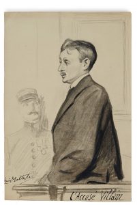 L'ASSASSIN DE JAURES EN PRISON, ET APRES SA LIBERATION. [Arrêté après l'assassinat de Jaurès, le 31 juillet 1914, Raoul Villain fut incarcéré durant toute la guerre, dans l'attente de son procès qui ne s'ouvrira qu'en mars 1919, et à l'issue duquel il fut acquitté et libéré.] 1er janvier 1916. Il espère son ami en bonne santé. Il a appris indirectement que l'un d'eux avait été fait prisonnier. Il a su que Pierre avait été ramené à Paris mais ignore s'il est guéri. La belle-sreur de Joseph est passée le voir fin septembre et lui a appris que ce dernier était dans la Marne, peut-être à Épernay. Il a su qu'André avait été malade : "est-ce lui qui est prisonnier ou toi ? En ce dernier cas, tes parents auraient l'amabilité de me donner de tes nouvelles”. Il est très étonné que Xavier n'ait pu lui répondre et se demande s'il aurait été lui aussi souffrant. Puis, au sujet de son instruction : "Tu as peut-être lu que mon procès était remis à huitaine indéterminée, probablement l'armistice ; il nous semble que à mon point de vue personnel c'est mieux d'autant plus que la raison pour laquelle on recule cette date améliorerait encore l'opinion si l'on en avait encore besoin. Et puis le président avait une réputation de bourru qui inquiétait fort mon frère”. Il est très ennuyé de n'avoir plus de nouvelles de ce dernier depuis quinze jours, recevant d'ordinaire des lettres régulières de sa part. Il a appris que Reims était à nouveau bombardée et s'inquiète : "Quand tes parents en étaient-ils partis ? Votre maison a-t-elle été elle aussi atteinte ?”. Il termine en souhaitant une bonne guérison à Pierre et "consolations et patience au prisonnier”. [Baden 10 janvier 1922]. Il lui envoie, ainsi qu'à sa femme, ses "meilleurs et tardifs souvenirs de première année. Que cette année voie donc la peste se répandre à Metz et que vous fassiez de bonnes affaires”. Zoppot Dantzig 4 juillet 1922 (vignette et en-tête Kasino Zoppot) [Villain s'était expatrié à Dantzig, où il exerfait le métier de croupier]. Il craint que sa lettre de juin ne soit arrivée "en période de presse”, et que Colaneri et sa femme aient été fort occupés : "je pensais même à tes succès scientifiques et à un domicile à Paris, nous en avions parlé à mon dernier passage à Metz”. Il lui reparle de l'affaire dont il l'avait entretenu car il la juge aussi intéressante pour M. hofman que pour eux : "si tu en jugeais ainsi pourrais-tu nous télégraphier ? Ou alors nous indiquer un particulier ou agent financier qui pourrait s'en occuper, car il ne fait pas de doute qu'elle soit très bonne”. ON joint un dessin au crayon et fusain par Louis malteste représentant L'accusé Villain lors de son procès (31 x 21 cm).