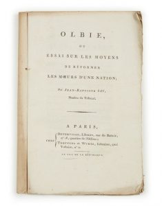 Olbie, ou essai sur les moyens de réformer les moeurs d'une nation. Paris, Deterville, Treuttel & Wurtz, An VIII, [1800]. 1 vol. in-8. Broché, couvertures bleues. XIpp, [1]p, 132 pp.