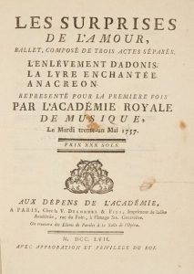 Les surprises de l'Amour, ballet composé de trois actes séparés. L'enlèvement d'Adonis. La Lyre Enchantée. Anacréon. Représenté pour la première fois par l'Académie Royale de musique. Paris, Aux dépens de l'Académie, la Veuve Delormel & fils, 1757. 1 livret in-4. Broché, couvertures de papier marbré. 22, 20 et 22 pp.