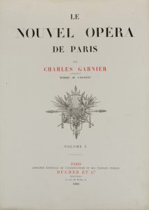 Le Nouvel Opéra de Paris. Paris, Librairie générale de l'Architecture et des travaux publics, Ducher et Cie, 1880. 2 vols in-folio. En feuilles, dos entoilé, plats cartonnés. Plats détachés, dos abimé. Album seul divisé en deux tomes comprenant un portrait de Charles Garnier gravé par Devaux et 75 remarquables planches gravées sur cuivre, lithographiées ou en chromolithographie. Le premier tome contient 35 planches dont 5 doubles, numérotées de 1 à 40, le second comprend 40 planches dont 20 planches en chromolithographies.