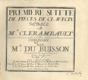 Premiere Suitte de pieces de clavecin dédiée à Mr Clerambault... composée par Mr Du Buisson Organiste de St Germain L'auxerrois. Gravée par Dumont. Paris, chez l'Auteur, Rue de L'arbre-secq, chez Mr Destrais, Md Fourbisseur, Le Sr Boivin... Le Sr Leclerc... [1734 ?] In-fol. oblong de [iv: titre (v° blanc); dédicace, Avertissement au v°]-19 p.; broché, couv. muette.