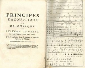 Principes d'acoustique et de musique, ou Système général des intervalles des sons, & de son application à tous les Systèmes et à tous les Instrumens de Musique. Inséré dans les Mémoires de 1701 de l'Académie Royale des Sciences. [S.l.n.d.] Petit in-4 de [i bl., ii titre]-68 p.-[1 f. de Corrections & remarques], et 2 pl. dépliantes; broché, couv. papier marbré.
