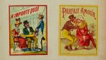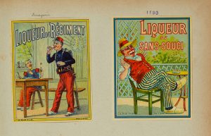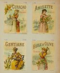 Rare ancien album de représentant en étiquettes d'alcool (passe partout) imprimées en chromolithographie, pour du Rhum, du vin, de l'absinthe et diverses liqueurs présentant souvent de belles illustrations (environ 180 pièces)