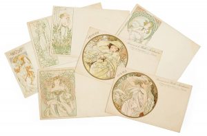 Ensemble de 7 cartes postales: mois de février et mars, la peinture, rèverie, été, oeillet et iris.