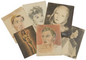 Ensemble d'environ 85 dessins au crayon en noir ou en coleur représentant majoritairement des actrices et acteurs de cinéma, français et américains, des années 40 tels que Arletti, Fernandel, Johnny Weissmuller, Edwige Feuillères, Madeleine Sologne .