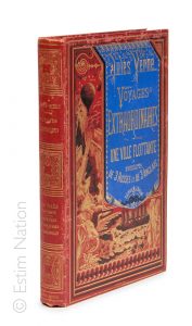 Gr. in-8° double, cart. " à la bannière " bleu sur fond rouge brique avec la mention " Édition " dans la bannière. 2e plat Lenègre de type " b ". Gardes bleu. Tr. dorées. Imp. Gauthier-Villars. Faux-titre daté 1873. Catalogue sans mention pour 1875-1876. Dos et mors mouchetés de petites décolorations claires dues à l'humidité. Sinon bel exemplaire " nature ". Gouttière impeccable.