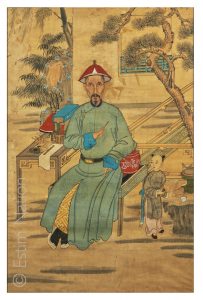 Encre et couleurs sur papier, portrait de lettré assis sous les pins, devant une maison le bras droit tenant un pinceau, le coude sur la table surmontée d'objets liés à la calligraphie, un enfant à ses côtés l'aidant.