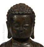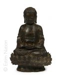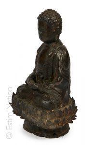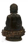 Statuette d'Amithayus en bronze à patine brune assis en padmasana sur un socle en forme de lotus les mains en dhyana mudra.