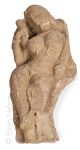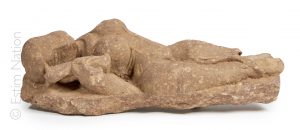 Partie d'ornement mural en grès représentant une divinité féminine déhanchée, tenant un bouton de lotus et parée de larges boucles d'oreilles