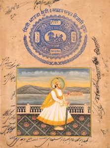 Dessin à la gouache sur papier portant le cachet du Gouvernement Jaïpur et des inscriptions à l'encre.