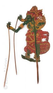 On joint une marionnette en carton découpé polychrome animé par des baguettes. Travail Indonésien (Bali ?) Hauteur : 55 cm