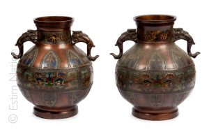 Paire de vases globulaires à deux anses en bronze à décor émaillé polychrome de motifs stylisés