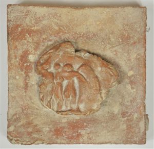 Carreau en terre cuite orné au centre d un médaillon en relief figurant des nus. Cachet de l artiste sur le côté.