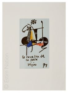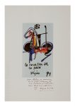 Estampe en couleurs rehaussée par l'artiste à l'encre bleue et au pastel rouge