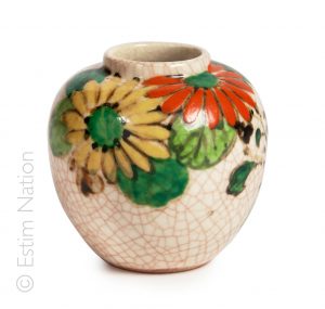 Petit vase boule en grès à décor émaillé de fleurs sur fond beige craquelé.