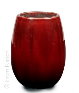 Vase piriforme en faïence à fond sang de boeuf nuancé, intérieur émaillé bleu nuancé aubergine.