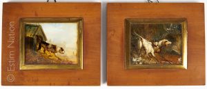 Chien à l'arrêt et chien devant sa niche