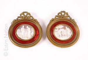 Paire de camées coquille, gravés de forme ovale, dans deux petits cadres ovales en laiton à décor d'un ruban doué et frises de perles.