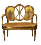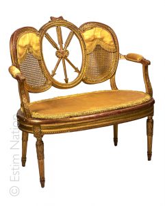 Banquette en bois doré et sculpté, dossier ajouré et canné à triple médaillon est orné au centre de trois faisceaux croisés, accotoirs à manchette à enroulement sculpté de feuille d'acanthe, assise ovale cannées ornée de frises de feuilles d'eau et de perles, dés de raccordement à fleurettes. Elle repose sur quatre fuselés et cannelés ornés de feuillage.