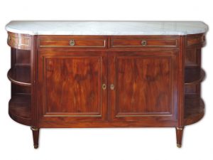 Buffet en acajou et placage d'acajou flammé ouvrant à deux abattants et deux tiroirs en ceinture. Les montants à demi-colonnes cannelées. Les deux extrémités en forme de demi-lune présentent deux étagères surmontées d'un tiroir. Il repose sur quatre pieds fuselés. Garniture de bronzes dorés aux entrées de serrure, pieds et filets. Epais dessus de marbre blanc veiné.