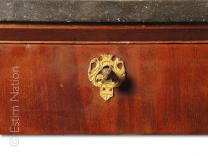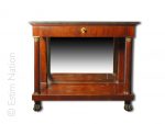 Console de forme rectangulaire en acajou et placage d'acajou ouvrant à un tiroir en ceinture. Montants à colonnes, fond de glace rapporté. Repose sur 4 pieds dont 2 en forme de griffes de lion en bois sculpté noirci.