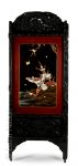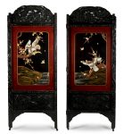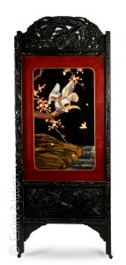 Paravent à deux feuilles en bois noirci sculpté en partie haute d'un dragon stylisé et d'un oiseau branché dans un médaillon en partie basse. Au centre, un faucon sur une branche sur fond de laque noir et or se détache en relief et plaqué de nacre. Au revers, la feuille est ornée d'un paysage.