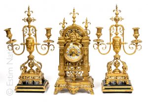 Garniture de cheminée en bronze à décor de têtes de lion et frises de fleurs de lys comprenant une pendule borne et une paire de candélabres à 2 bras de lumière. Avec 2 socles en bois noirci et doré, un balancier.