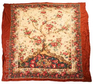 Tissu imprimé à décor de personnages, de fleurs et d'oiseaux.