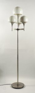 Lampadaire en aluminium brossé, chrome et verre à quatre feux.
