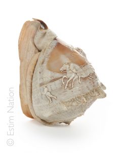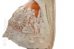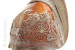 Coquillage à décor finement gravé en camée d'un paysage napolitain animé d'une voiture à chevaux et personnages fuyant l'éruption de Vésuve.