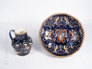 Ensemble en faïence comprenant une coupe creuse les bords mouvementés et un pichet à fond bleu nuit à décor néo Renaissance. Signé GIEN France