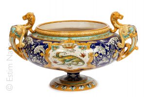 Large coupe à deux anses sur piédouche en céramique émaillée à décor polychrome du chiffre et du symbole de François 1er dans le style de la Renaissance.