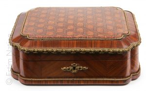 Le couvercle légèrement bombé à décor de marqueterie de motifs hexagonaux et filets à l'imitation du cannage. Ornementation en métal doré de frises de perles et de guirlandes fleuries.