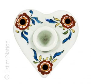 Encrier en faïence affectant la forme d'un coeur, à décor polychrome de fleurs et bouquet en bleu, rouge, jaune et vert.