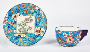 On y joint une tasse à thé en faïence à décor d'émaux polychrome figurant des branches fleuries, anses géométriques à fond bleu.