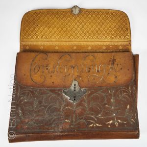 Porte-document à soufflet en cuir doré à décor de rinceaux feuillagés en fil d'argent, ouvrant par une serrure et plaque de serrure en argent à décor gravé de rinceaux.