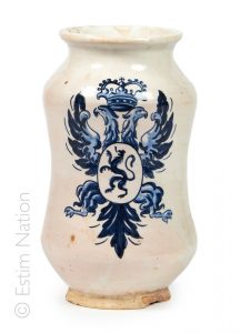 Albarello en faïence à décor bleu de lions et d'une couronne. Travail XIXème siècle, probablement Espagne.