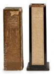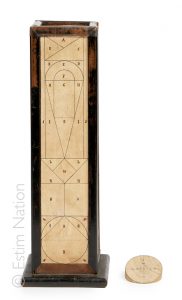 Colonne composée d'éléments en bois annotés à l'encre et assemblés surmontée d'un capuchon de protection en papier épais. Un commentaire manuscrit, vraisemblablement réalisé par son inventeur, est collé sur un des flancs : 'Description des figures sur lesquelles l'étude a été faite et réussie à toute épreuve/Voir dans cette boite la décomposition d'un prisme quadrangulaire en pièces identiques'.../La décomposition l'a morcelé en dix-neuf pièces des plus variées pour la forme et des plus arides pour le calcul.../Le 1er janvier 1885'