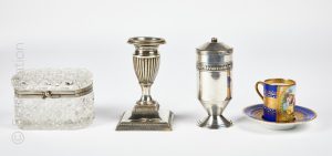 - Bougeoir en métal argenté, bobèche à décor d'une frise de perles, fût balustre à godrons, reposant sur une base carrée à degrés.