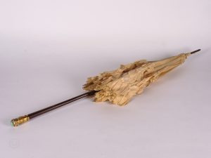 Ombrelle le manche en thuya garni à la base d'une bague en métal doré à décor en relief de guirlandes et rubans terminé par un cabochon d'aventurine, soie rose à volants (nombreuses déchirures). Fin XIXème - début XXème