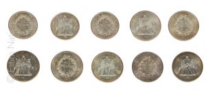 Lot de 7 pièces de 50 Francs "Hercule" en argent datées de 1975 à 1978. Poids brut : 209.82 g