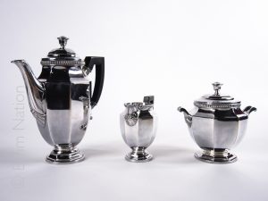 Service à thé à pans coupés en métal argenté, manche bois noirci comprenant : sucrier, pot à lait et verseuse.