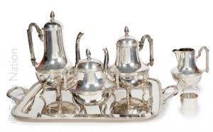 Service à thé/café et son plateau en métal argenté à décor de jonc rubané