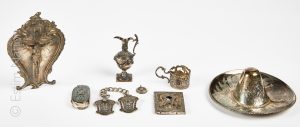 - Aiguière miniature en argent à décor de hures de lions réunies par des guirlandes fleuries, terminée par une base circulaire ornée d'une frise perlée, signée sous le pied G. ACCARISI FIRENZE.