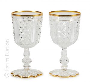 Paire de verres sur pied en cristal à riche décor taillé de pointes de diamant et liserés or